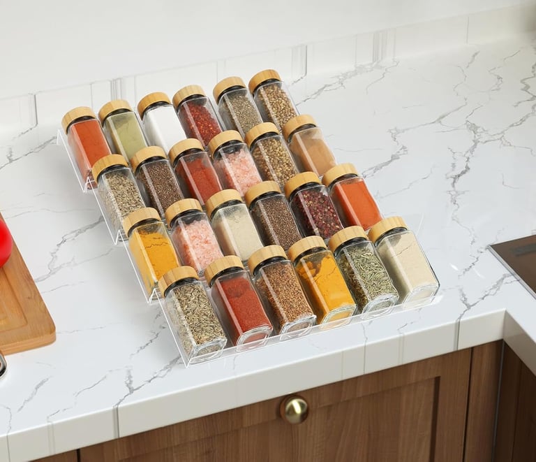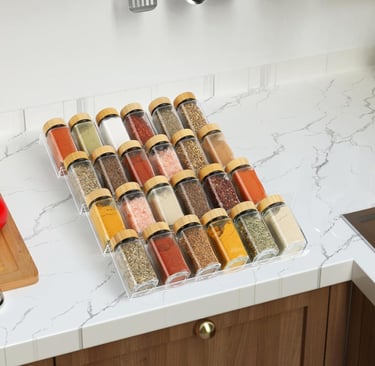 A Lazy Susan (turntable) is a game-changer for deep or hard-to-reach cabinets. With one spin, every spice becomes accessible — no more knocking over jars or digging behind containers.